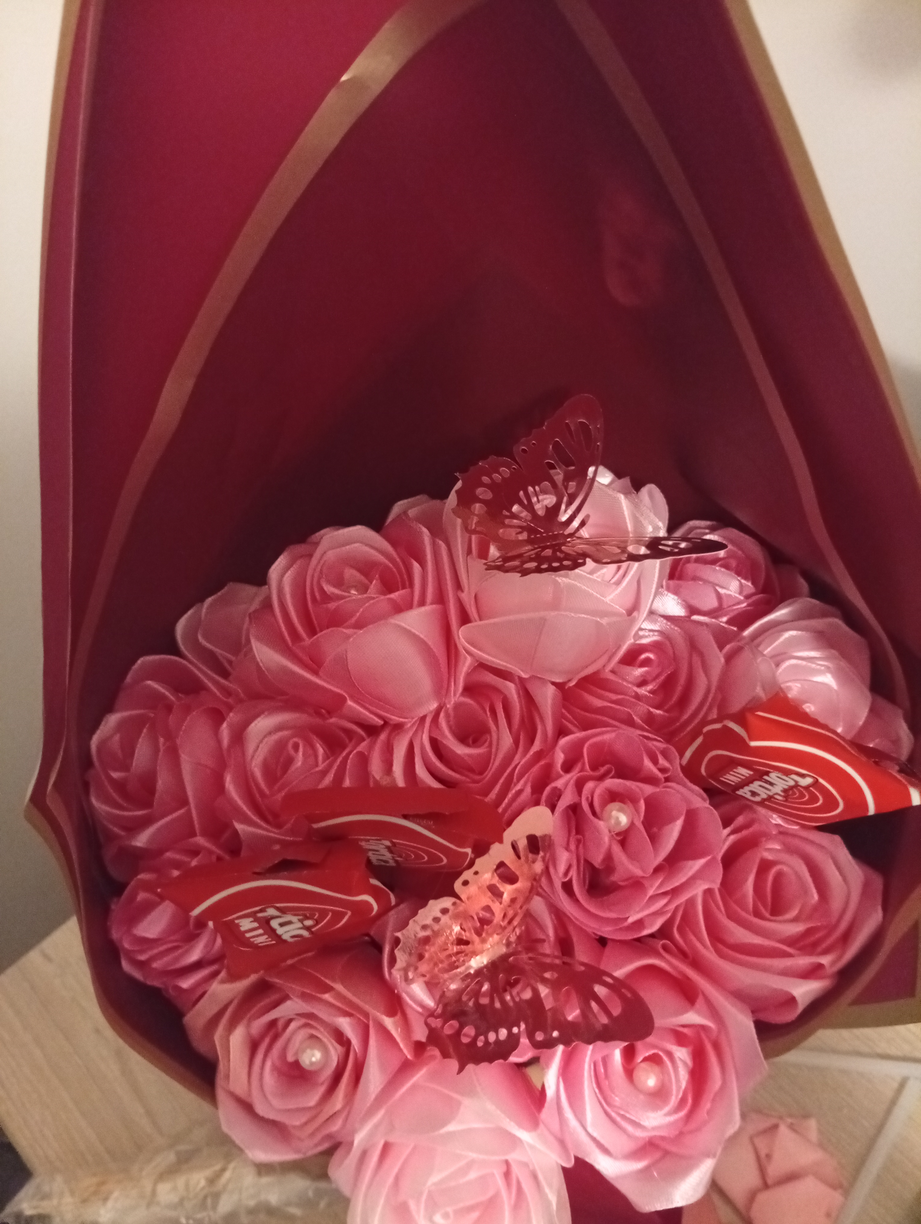 Elegantni ružičasti buket od satenskih ruža, obogaćen slatkim iznenađenjem u vidu čokoladica. Savršen spoj nježnosti i slatkoće, idealan kao poklon za rođendan, godišnjicu, Valentinovo ili znak pažnje dragoj osobi. Dugotrajan i bez potrebe za održavanjem.